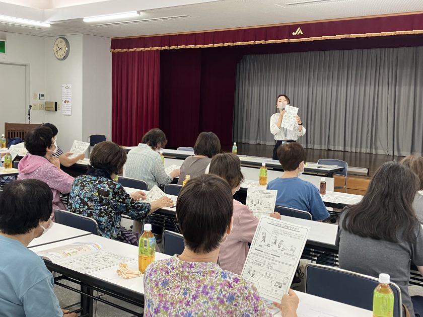 高松中央地域女性部高松市太田支部・桜町支部 合同健康教室 投稿日:2025年10月21日 高松中央地域女性部高松市太田支部と桜町支部は合同で10月1日、高松市太田支店において健康教室を開催しました。 両支部より部員46人が参加。高松市役所長寿福祉課の職員を講師に招き、「フレイル予防講座」と題し、フレイルを予防するためにはしっかり食べること、筋力を鍛えること、しっかり噛むこと、人や地域とつながることで、どの項目もバランスよく実践することが大切であると学びました。 部員からは「いい話が聞け、さっそく生活習慣を見直します」との声が聞かれ、有意義な講座となりました。