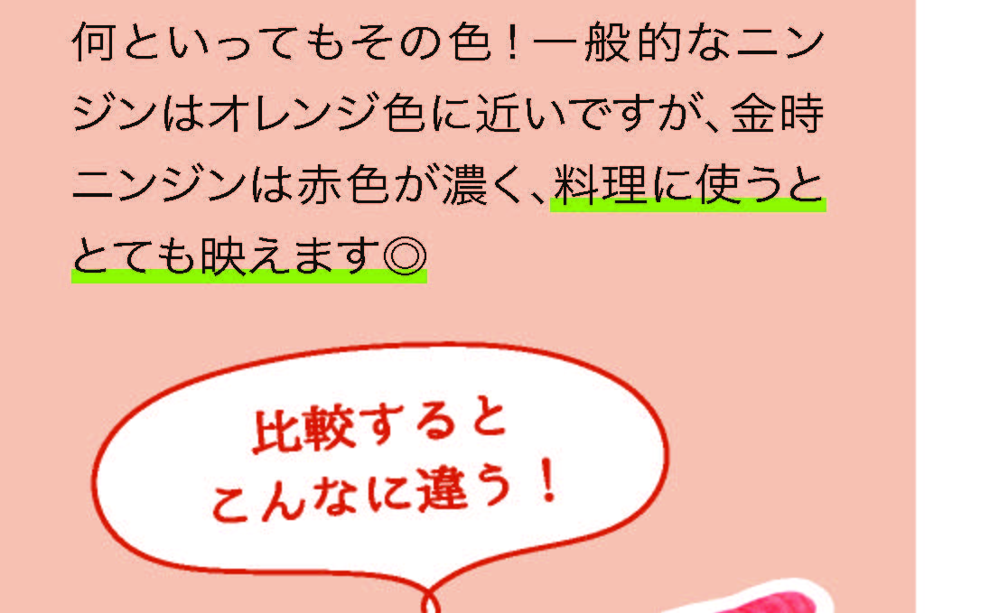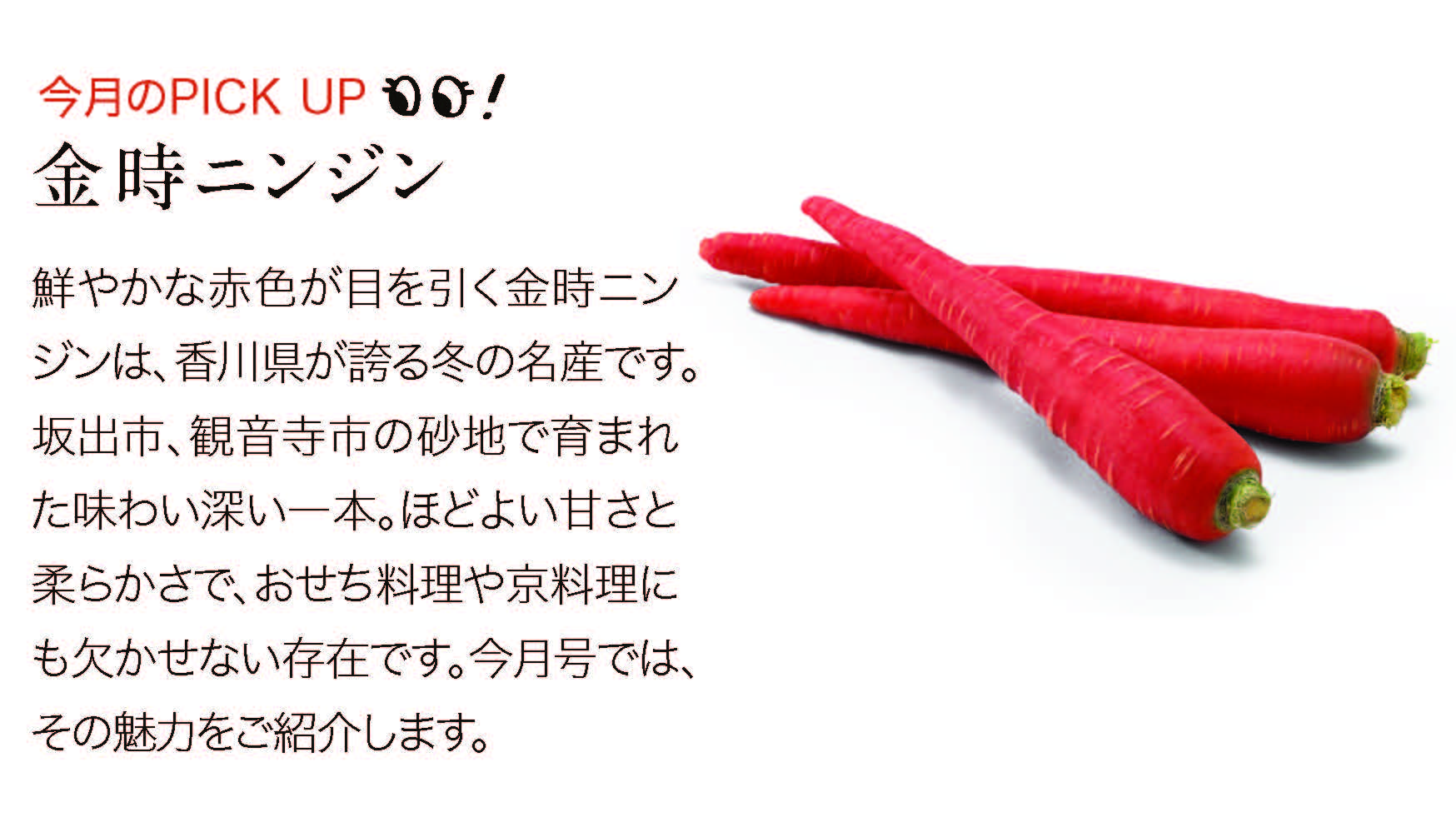 香川県のお正月になくてはならない金時ニンジン!一般的なニンジンと違うポイントがたくさんあります。強い甘みやみずみずしさが自慢です。