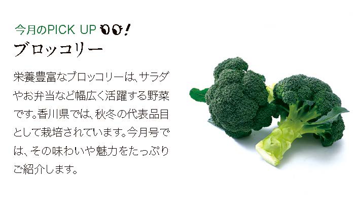 2026年2月号 投稿日:2026年2月2日 2026年2月号をデジタルブックで見る 【特集】 レベル1からはじめる 生産者ライフ 生産者の方々は、経験を重ねるごとにスキルやステージがレベルアップしていきます。ゲームと同じように。今回は、栽培歴の異なる3名に、それぞれの歩みと現在の課題、そして描く未来像を聞きました。 旬の解剖!-かがわの-農産物図鑑 秋冬を彩るお弁当の名わき役 ブロッコリー 地産地消レシピ@香川県 見た目もインパクトも味! ブロッコリーのステーキ 1人分あたり・・・約173kcal