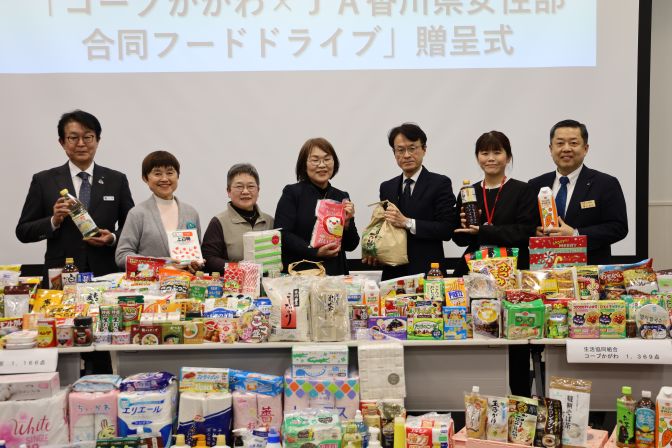 JA香川県女性部と生活協同組合コープかがわは3月12日、高松市の香川県JAビルでフードドライブ活動の贈呈式を行いました。各組織がそれぞれ県内各地で集めた食品や日用品を特定非営利活動法人フードバンク香川に寄贈しました。